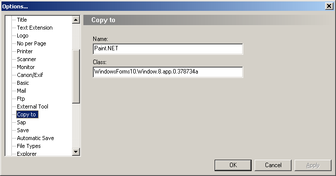Still under Options, select the Copy to entry in the left pane (or tab). Give the application a descriptive name and paste in the information you copied above into the Class text box. Then hit Ok.