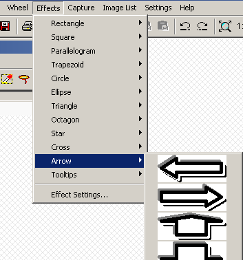 Go over to the Effects menu and choose a shape or effect that you would like to use. This will turn your cursor into a set of cross-hairs. Drag out the effect where you would like it to appear.