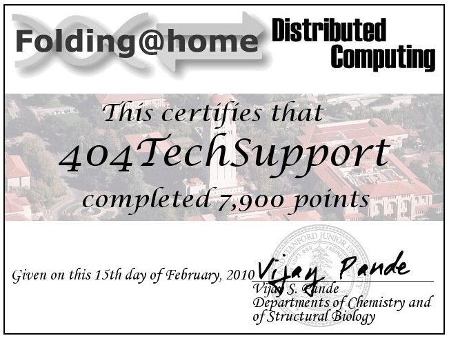 Partially for tracking and partially for motivation, Folding@Home allows you to monitor your statistics about how many work units or points you have earned through spare processing power. You can see your individual statistics or team statistics. If you’d like to join Team 404 Tech Support, use team number: 180008