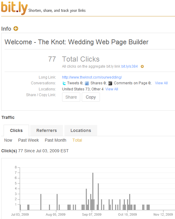 Bit.ly – Bit.ly is a URL shortening service similar to TinyURL and the other multitudes of the service but I prefer Bit.ly for a variety of reasons. We wanted to use Bit.ly in our wedding announcement because the URL you get for “Your Website” through The Knot was terrible. To fix that, we put the long URL through Bit.ly, which made less to type and less room for typos. Bit.ly also provides statistics about your URL to show how much traffic it’s seen. If you visit a Bit.ly URL and append a ‘+’ (plus sign) onto the back of the URL, you can get to the Info page for that URL. Bit.ly allows you to make custom short URLs, but they’re case-sensitive so make sure you take that into consideration when you create yours.