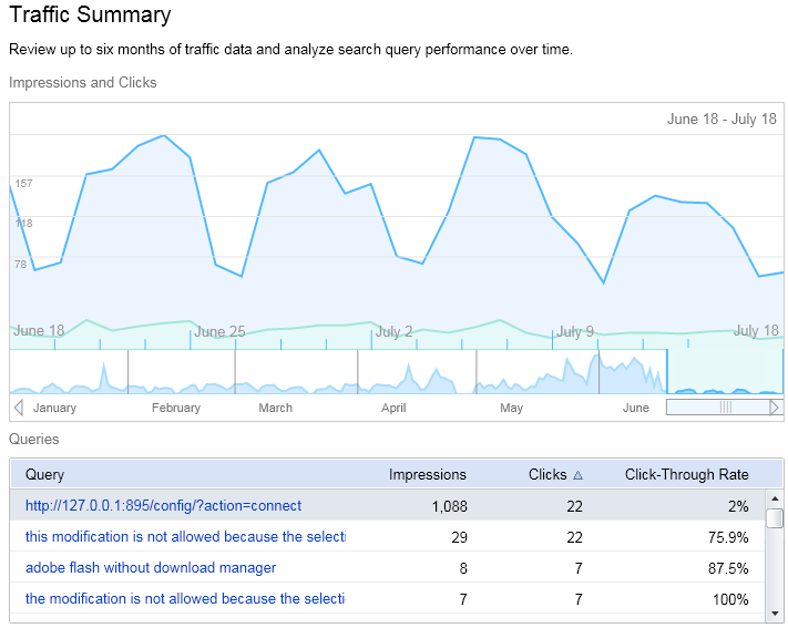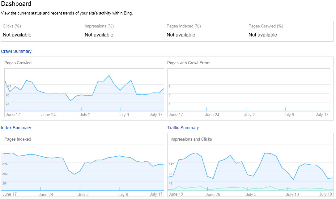 Once you’ve met the prerequisites, you’ll be able to get in and see the Dashboard. This gives you a quick summary of Pages Crawled, Pages Index, Pages with crawl errors, and impressions and click-throughs from the search results.
