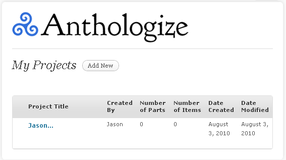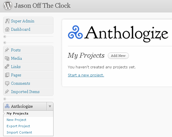 Once you have the plugin installed and activated, you’ll find a new entry on the left-hand column of your WP admin fittingly called ‘Anthologize. If you expand it, you’ll see some options and since this is your first look at Anthologize, you’ll want to create a new project.