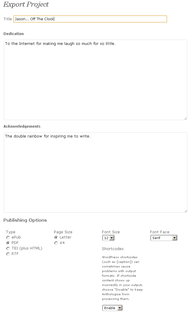 The next section allows you to write a dedication and acknowledgment section before you choose the publishing options. You can export in several ebook formats, including PDF, EPUB, and TEI.