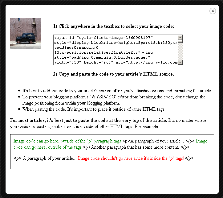 Once you click on a picture, you’ll get a little pop-up layer to customize the picture. You can choose how the picture aligns with text and the size of the image. You’ll get a live preview below with each change you make. Once you’re got it how you’d like it, you click the ‘get the code’ button.