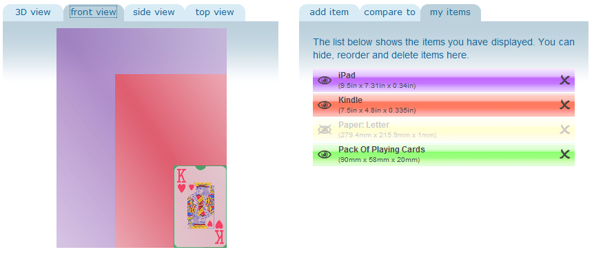 You can add any item and its dimensions to create an object on the left for comparison. Below, I added Amazon’s Kindle and entered the dimensions I got from its description page. Sized Up then created the red object to visualize its size. You can flip through the tabs to have a 3D view, front view, side view, and top view.