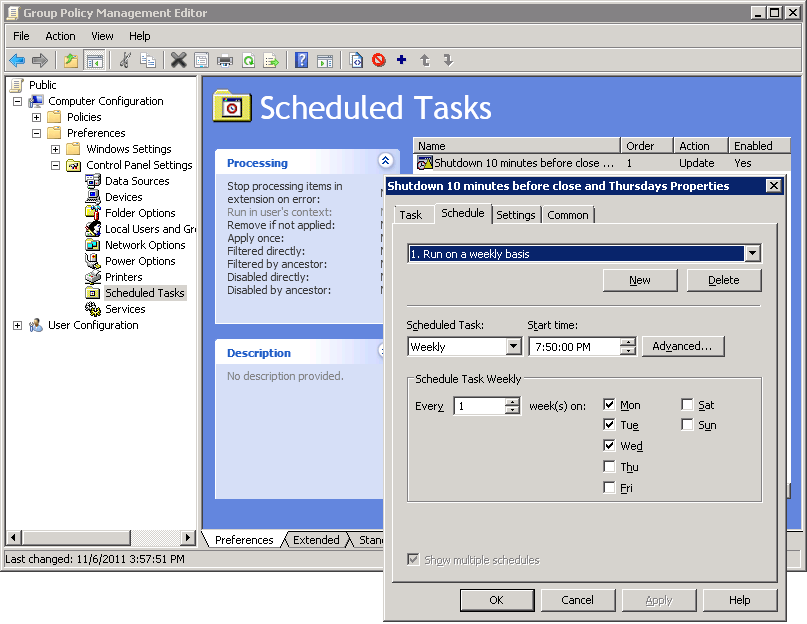 It’s a simple, customizable, and effective way of telling people that the organization is closing for the night and powering off the computers. All is well and good, except there is a timer bug in Group Policy Preferences scheduled tasks as well.