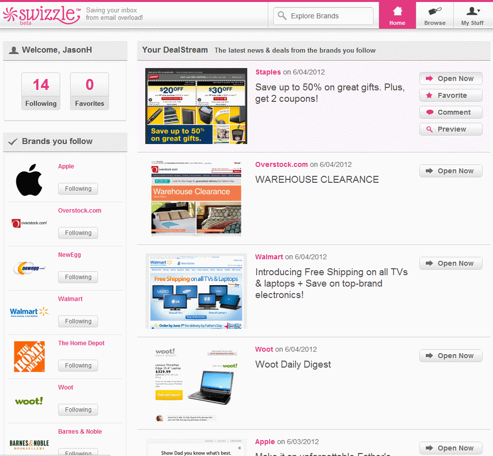 Swizzle, still in beta, has over 1,100 companies on board. You can choose which to follow based on your interest or visit their individual pages whenever you plan to do some shopping from that vendor. You can see companies like Apple, Target, Macy’s, Gap, Starbucks, NewEgg, Home Depot, and many more are available.